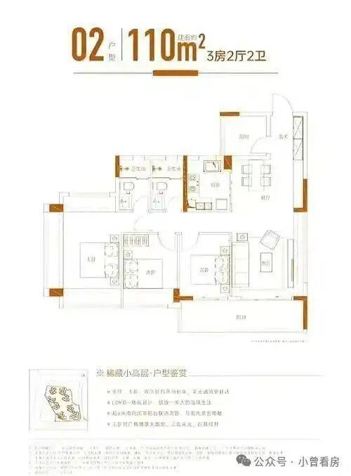 110㎡三房:西南朝向,双阳台配置,客厅与主卧尺度优于二期,适合二孩家庭。