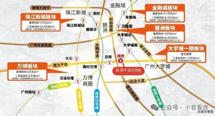 交通地铁:星河盛世锦城位于万博 CBD 北侧,直线距离 7 号线板桥站约 700 米(三期组团稍远),实测步行 10 分钟内可达。地铁 2 站到万博、5 站到琶洲,换乘 18 号线可快速通达珠江新城,适合在天河、海珠上班的通勤族。自驾方面,出门即上南大干线,无缝连接广州南站、金融城等核心区,实测 30 分钟可到珠江新城,交通便利性是最大卖点之一。