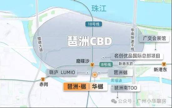 最近的地铁,还是琶洲西区最核心、8/18号线双线交汇的磨碟沙地铁站,仅隔着一条新港东路,直线距离约200米。