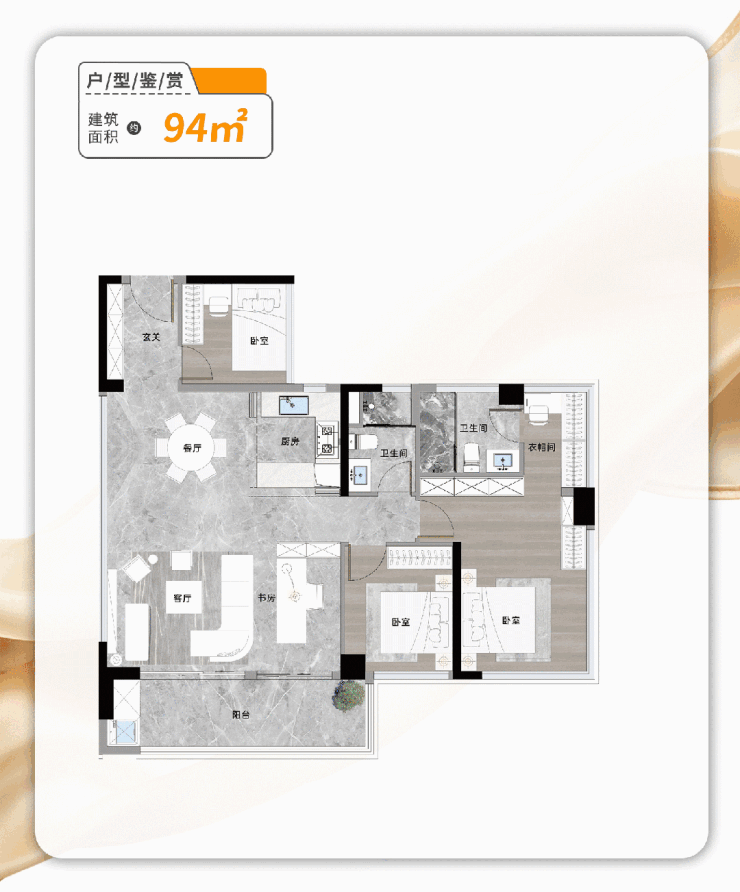建面约94㎡四房两厅两卫户型,同样拥有独立玄关,豪华主套全明通透,户型舒适性极强,ldkg一体化设计,约6.4米超大阳台设计。