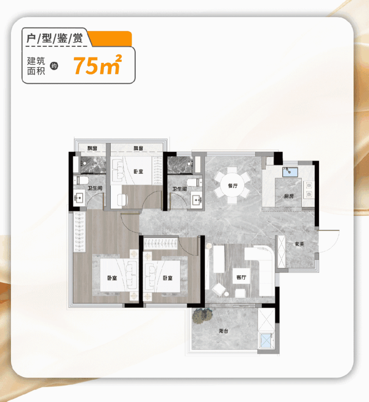 建面约75㎡三房两厅两卫户型,独立玄关,可改做储藏室,收纳空间爆棚,南北对流,空间通透,厨房是主流的u型设计,奢华主套带有独立卫浴,拥有270°环幕视野。