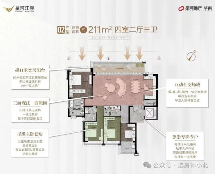 1、2、3栋的面积段均为179㎡,4栋的211㎡,4栋是星河江缦总层最高的一栋,30层高,南北都能望江,白天鹅楼栋也能映入眼帘,其中5层以上是住宅区,1-4层为业主会所,诸如健身房、高尔夫球练习室、茶室、共享厨房等功能区。