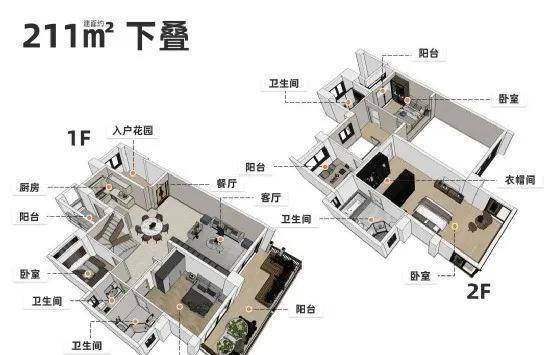 下叠户型建面约211㎡,但注意了,它自带有超大花园,面积媲美一个小户型!
