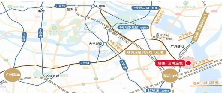 莲花湾板块,属于番禺东石楼镇,整体发展缓慢,配套不齐全,得益于南大干线的开通,缩短了到市区的距离,开车出行非常方便,比如到琶洲30分钟左右,还有规划地铁8号线东延段,但是也要3-4公里,跟17号线,还有两条城轨,一条高铁,打造所谓的五轨交汇的莲花湾TOD,不过都是需要时间兑现,哪怕建好都是不近现在在售的楼盘,也要2-3公里。