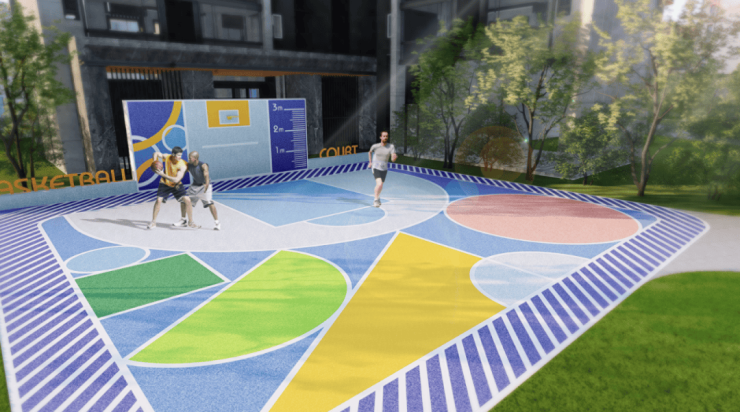【运动健身区】包含篮球场、羽毛球场和乒乓球场