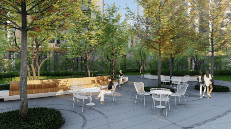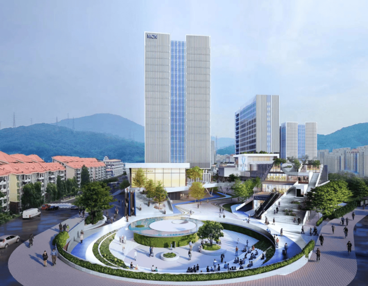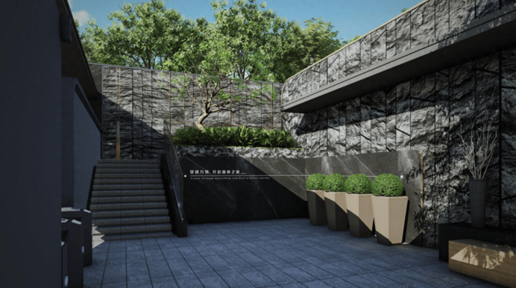 小区的空间布局遵循“一纵一环九节点”,整体为现代化简约风格,结合周边珍贵自然资源,设计理念融合山色与流水概念,创造以“流动 的森林”为主题的园林。