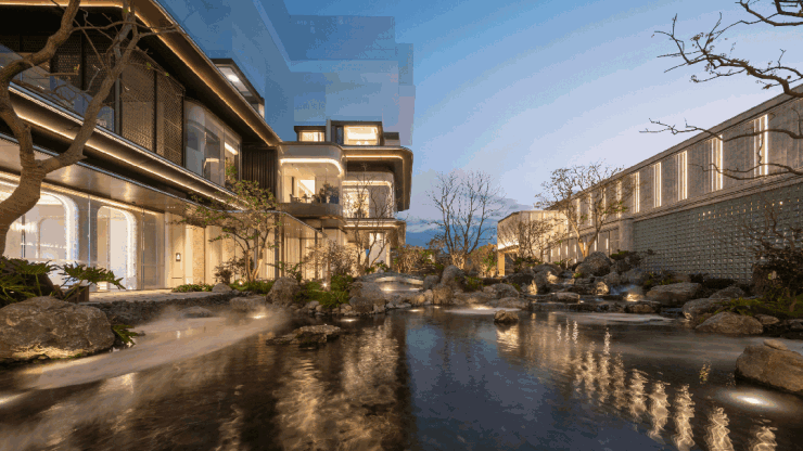 主入口的弧形线条和温润石材,营造出一种归家的仪式感,静水池倒映着天光云影,进门一瞬间就把外界的喧嚣隔在了身后。
