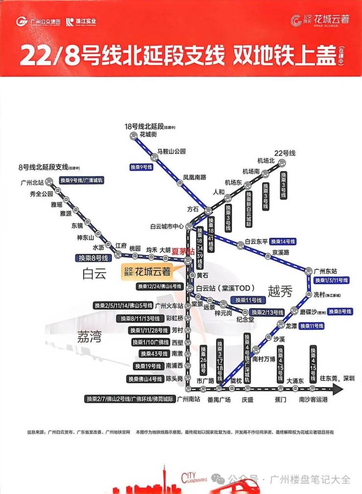 卖点二、全国最【快】22 号线!时速约160公里,1站白云新城旁,2站越秀,3站荔湾!22号线:广州南北大动脉,1站白云站TOD,2站越秀火车站,3站荔湾彩虹桥站。(22号线夏茅站已动工),8号线北延段支线 :迅达白云、越秀,串联广州北站、 白云站TOD、越秀纪念堂。(8号线北延段支线已动工)