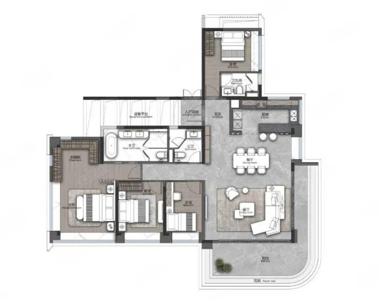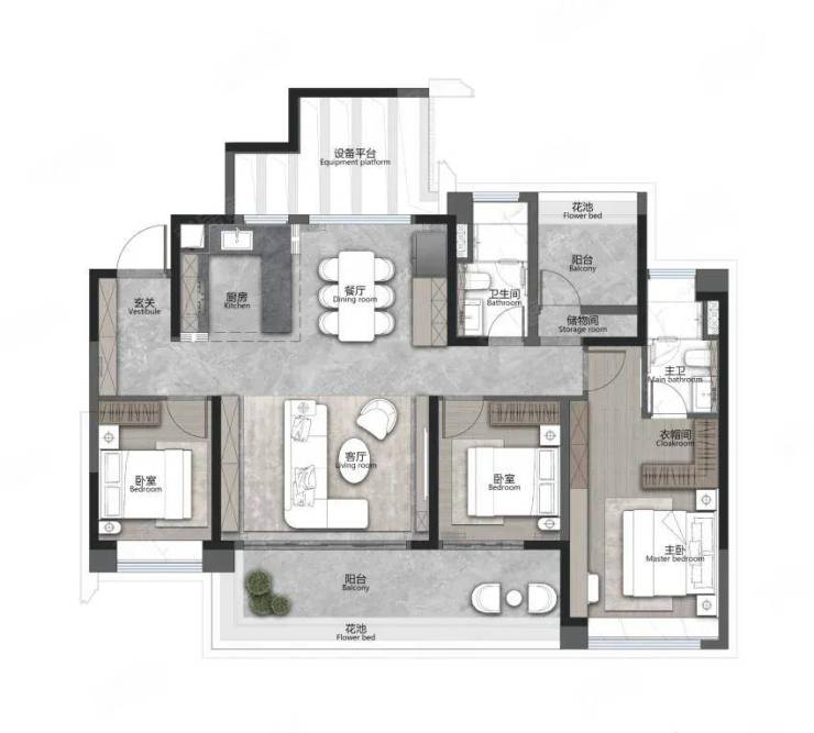 目前在售的户型覆盖刚需到改善需求,得房率超过 100%,每户还配备 5-8㎡的设备平台,相当于额外多出一间房。