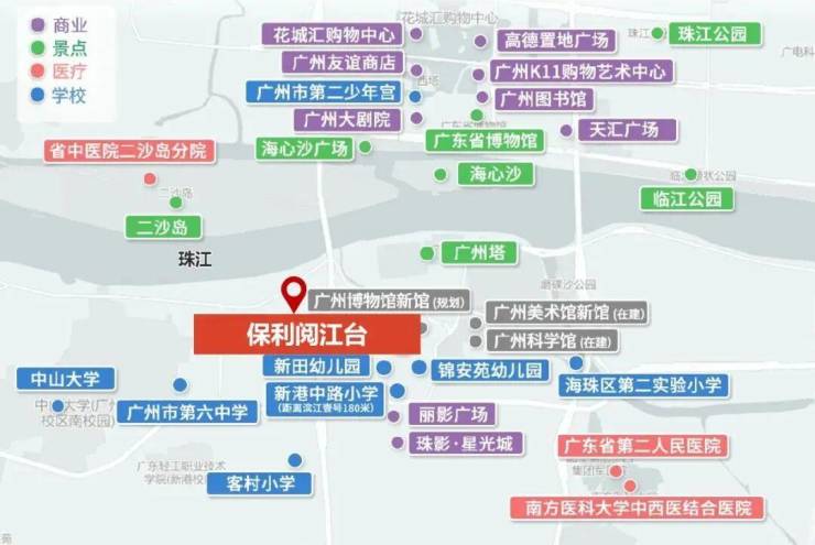 ○ 5大优质学府:广州绿翠实验学校(省级)、广州市第六中学(省级)、新港中路小学(市级)、大江苑小学(区级)、中山大学(重点)