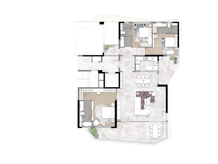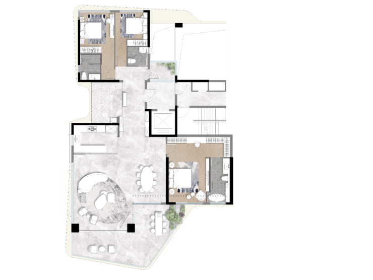 这个户型为3+1,3卫双套房设计。
