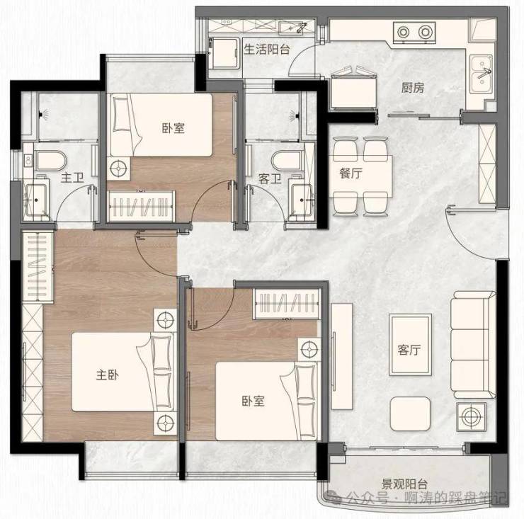 双入户大堂,星级五层地下车库,匠造建面约 69-144m²臻美二至四房,户户双阳台,LDK 一体设计, 布局方正实用。