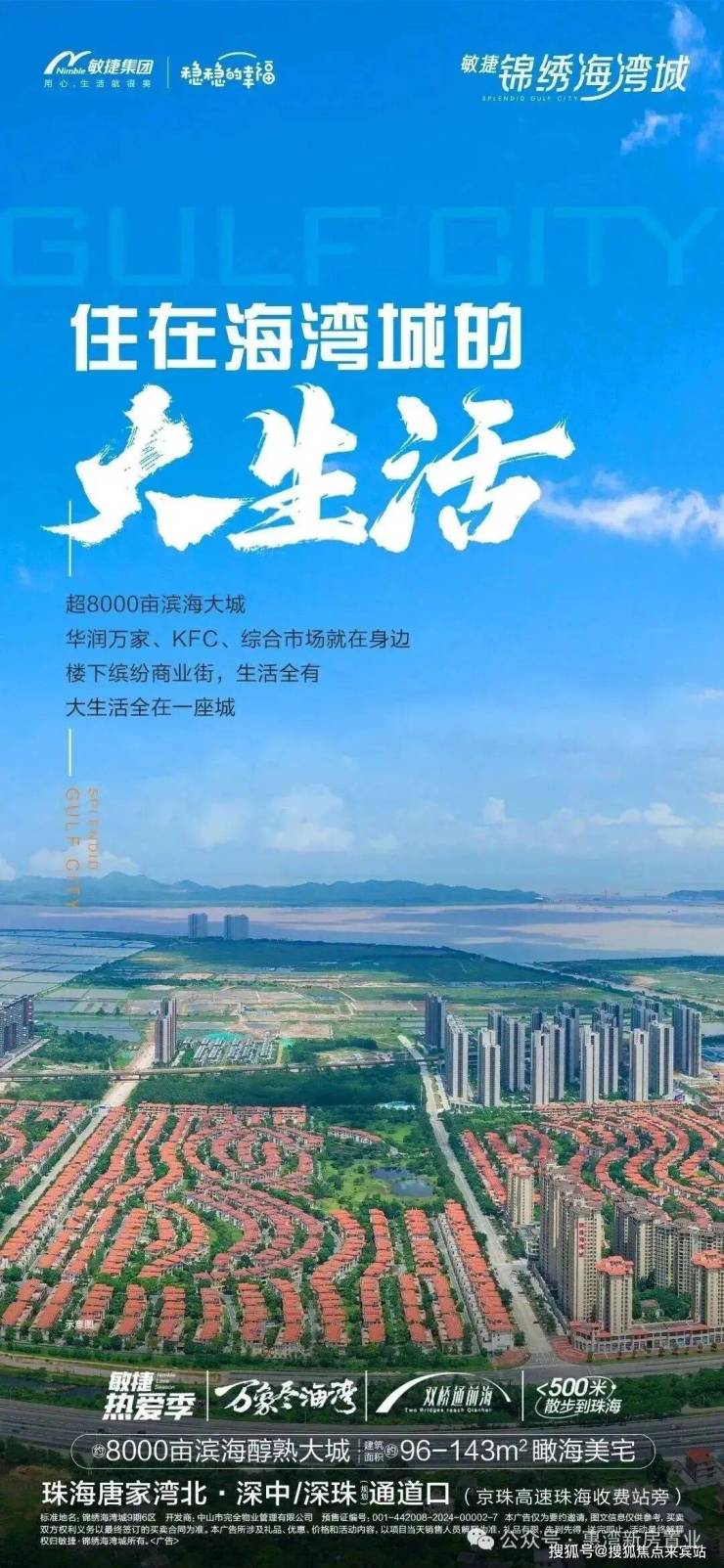 锦绣海湾城项目坐落于中山市翠亨新区伶仃洋海湾区,是华南少有的海湾生态居住区的大型滨海项目,项目总占地约万亩,社区早期建设有联排/独栋别墅、洋房、公寓及商铺等多元化产品;现在售产品为约90-127㎡临湖洋房,以及约155-195㎡的花园美墅。