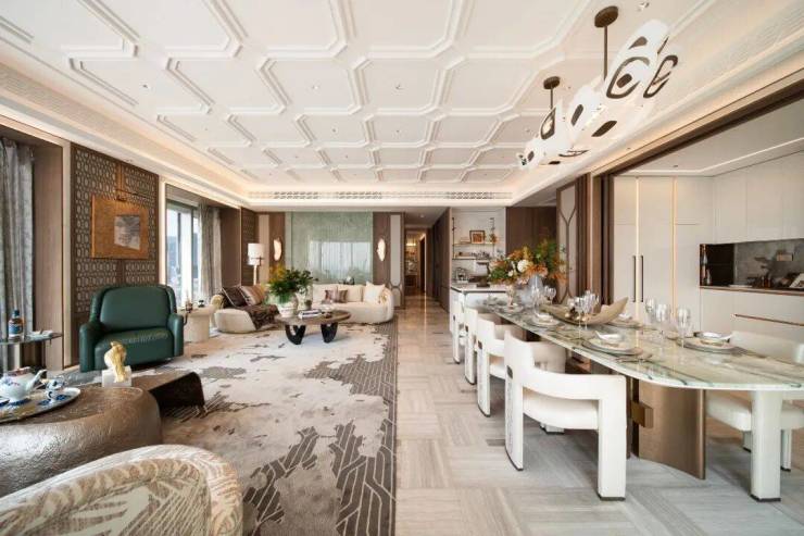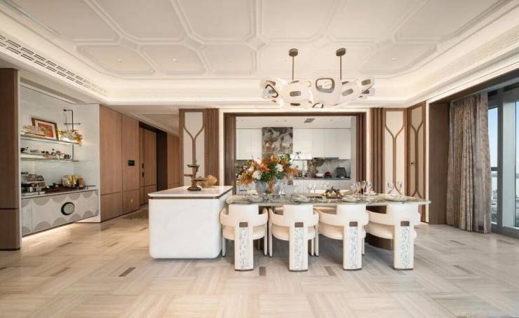 墙面、地板采用大面积奢石和拼花,客厅背景墙是Tiffany绿奢石,厨房推拉门镶嵌了金箔,主卧地板则采用方弧形木拼花,全屋带落地窗等。