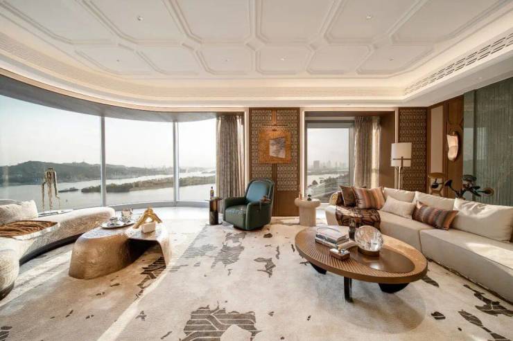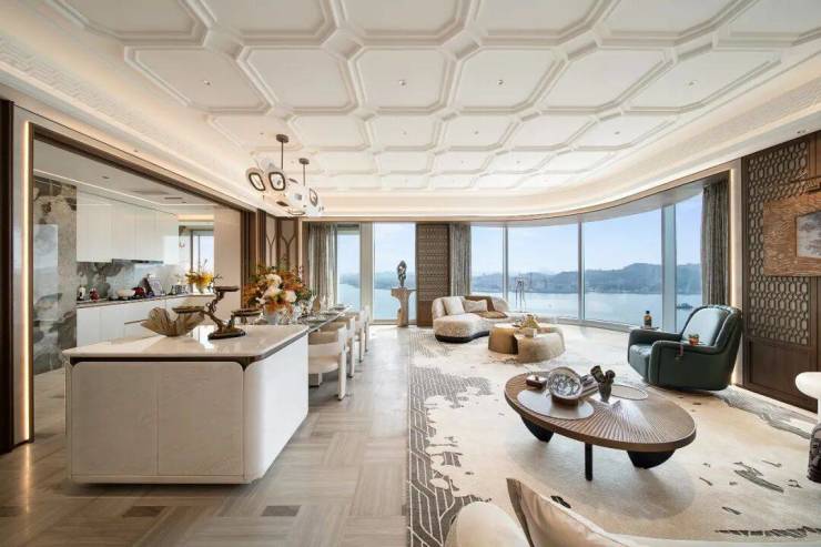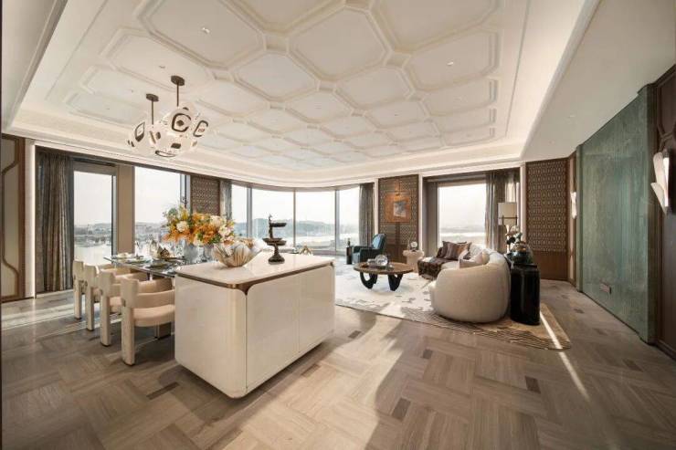 客厅3.55米层高,秒杀很多豪宅大平层。没做传统的270°折角窗,而是打造了270°环幕弧形落地窗,可以沉浸式感受1000米江景面、珠金琶鱼CBD一体景观。