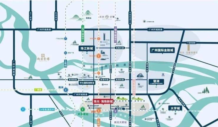 海珠新城地处交通要道,周边有三座跨江大桥(番禺大桥、新光大桥、洛溪大桥)以及规划中的两条过江隧道,增强了南北向的连通性。