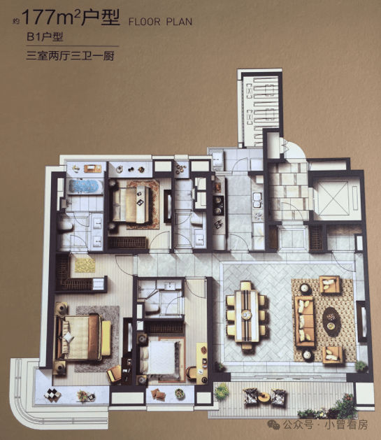 176㎡四套房户型设计亮眼,L型环幕玻璃包裹80㎡LDK大方厅,北向8米大落地窗与东侧落地窗衔接成全景视野,四个卧室均带独立卫浴且为明卫,三个主套朝南,长辈房配备独立阳台,空间利用率与舒适度兼顾。