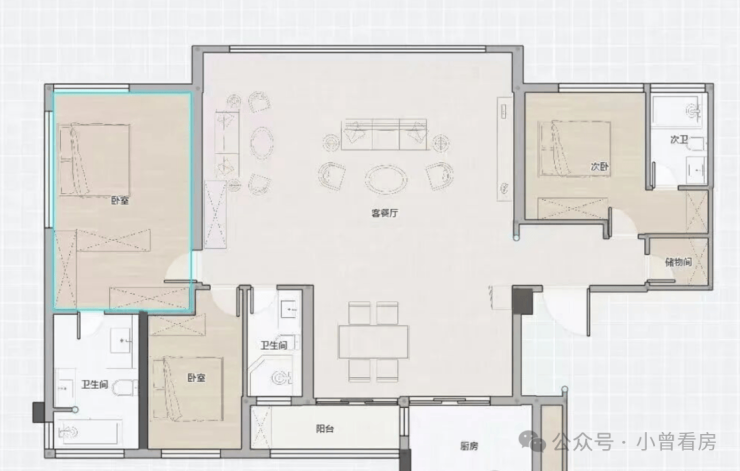 165㎡双主套飞机户型主打南北双阳台,形成通透对流格局,北向17米的观景面让客厅、主卧、次主套及次卧都能直面江景,搭配9米景观阳台,视野开阔,还可根据需求灵活调整主卧朝向,兼顾采光与景观。