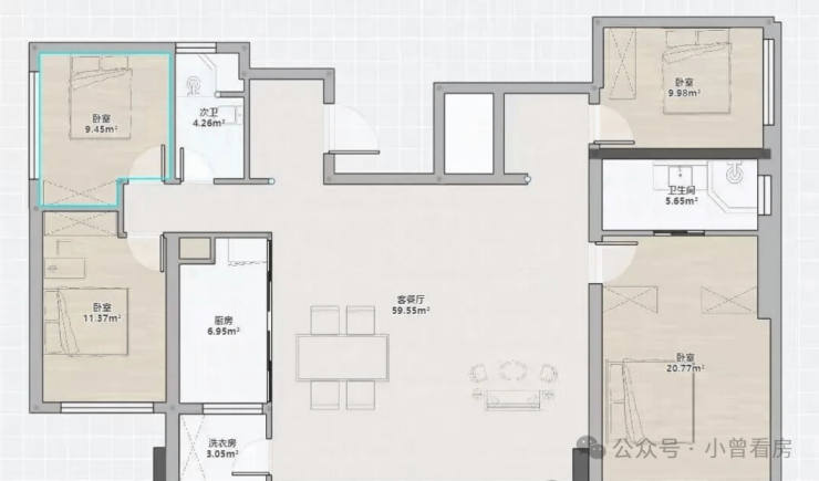 133㎡四房两厅两卫采用经典四叶草布局,四个卧室分布在四角,保障家庭成员的私密空间,客餐厨横向并排设计让空间更通透,主套配备270°视野,高楼层可欣赏江景,适合改善家庭居住。