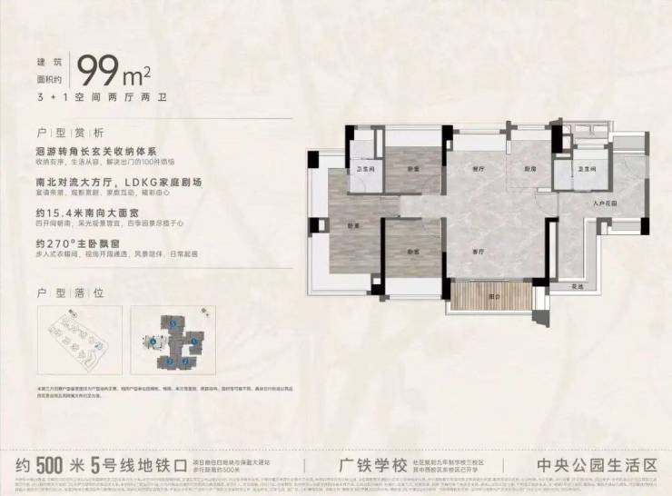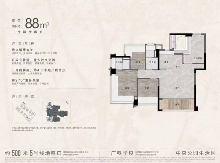 项目加推“中央公园”,紧邻大脚印公园,距离地铁约500米,紧邻学校、酒店,户型涵盖75-88㎡三房,105、125、142㎡四房。