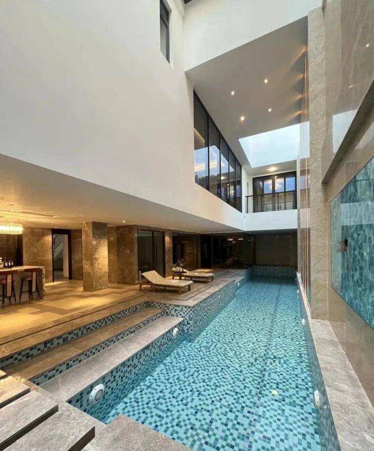 悬浮泳池的通透设计是全屋的一大亮点,无论往上看还是往下看,都能感受到强大的视觉冲击。