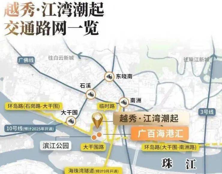 从板块发展来看,项目位于海珠湾核心区,紧邻规划中的 1.7 万方滨江公园,步行可达江边绿道。随着海珠湾隧道 2025 年开通,自驾 15 分钟直达广州南站,地铁 10 号线大干围站(距项目 650 米)串联中大、体育西等核心商圈,交通便利性在江景盘中实属罕见。更值得期待的是,周边规划 66 班完全中学,广百海港城 2025 年底开业,板块配套正加速兑现,未来增值潜力可期。