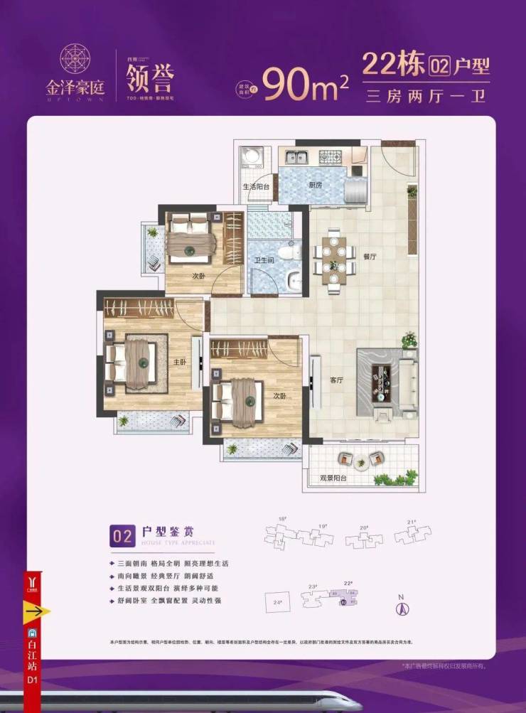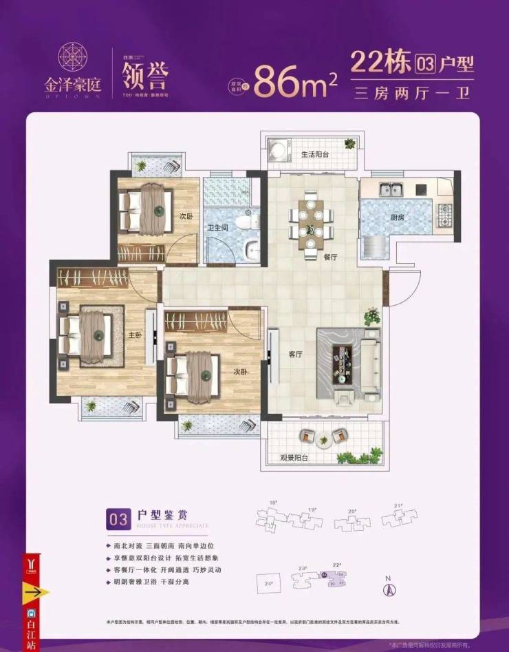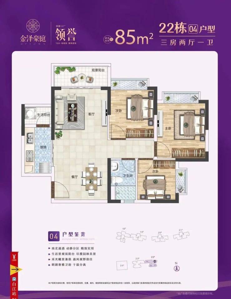 【金泽豪庭】户型设计方正,空间灵动,高得房率;客餐厅一体,扩展室内共享空间,尽显通透美观;阔绰景观阳台,180°景观视野开阔,与四季园林美景坦诚相见;三卧室设计,进可享三代同堂,其乐融融;退可互不干扰,兼顾家族成员所需。