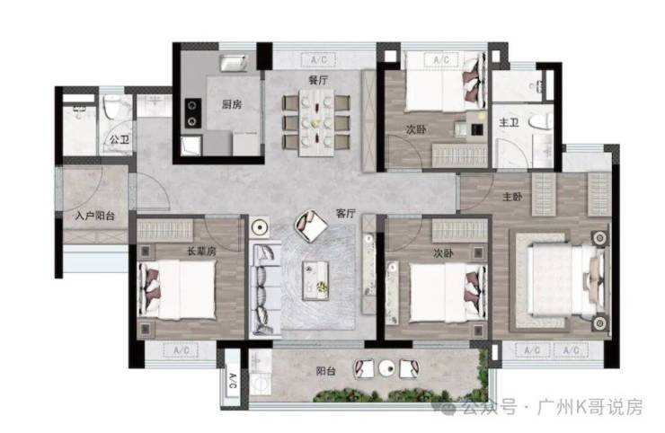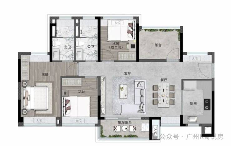 全屋多达6处飘窗赠送,主卧正面飘窗+转角飘窗、玄关飘窗、次卧飘窗、公卫飘窗