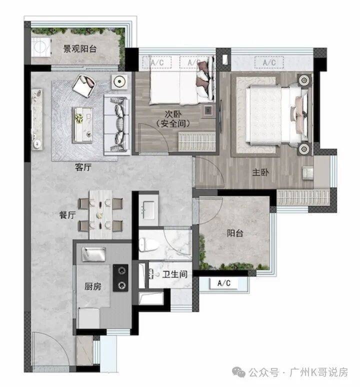 ✅景观阳台约5.5米面宽,连接次卧;阳台面积占比约15%;