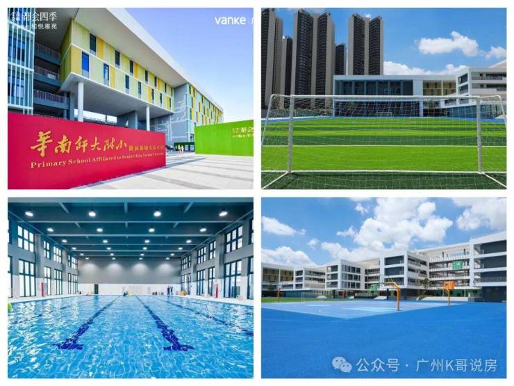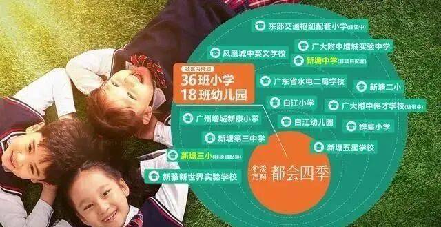 自身配套18个班的幼儿园以及引进华南师范大学附属小学(48个班),现在已经开学了,是广东省唯一一所受直属广东省教育厅和华南师范大学双重领导下的省一级学校,被评为“全国百强小学”,多次收到国家级、省部级的表彰及奖励,全校教师均来自于名牌大学,是广州市教学质量最好的小学之一。