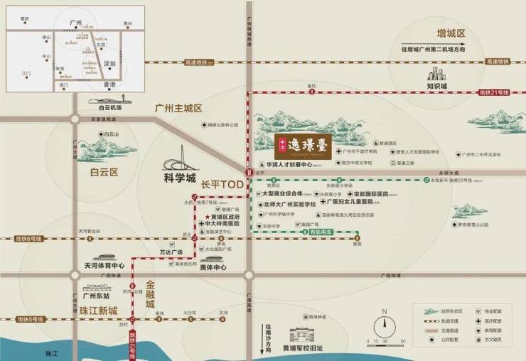长岭新城未来将打造成为 广州东部山水新城生态宜居示范区、萝岗区新型城区,体现 “智慧城市”、“绿色社区”、“岭南风格”等区域特色,形成集高端居住、国际办公、商务办公、文化旅游等功能为一体的绿色社区。