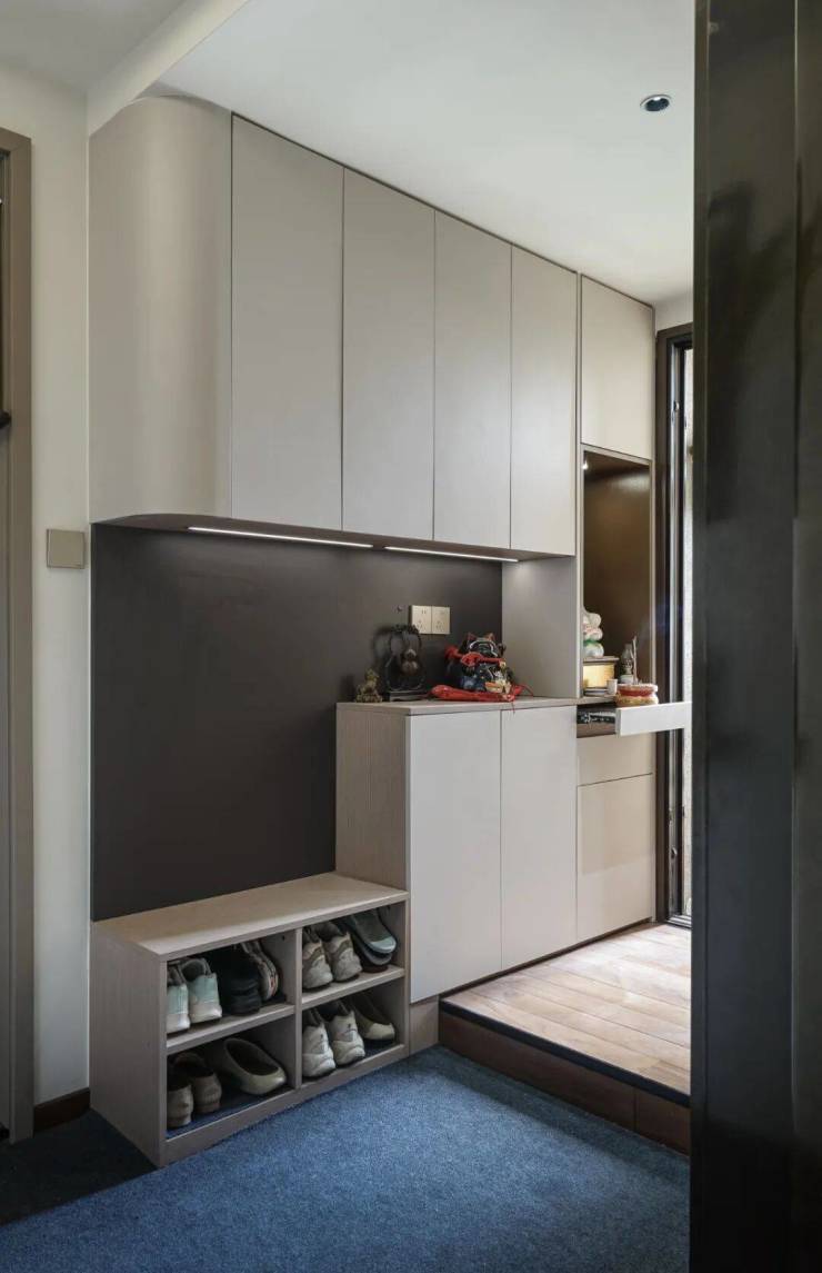 入户部分柜子功能max,冰箱,全屋净水设备,佛龛,热水器都被收纳得妥妥贴贴的,设计,木作还有施工的配合上都下了大功夫才能达到的效果。