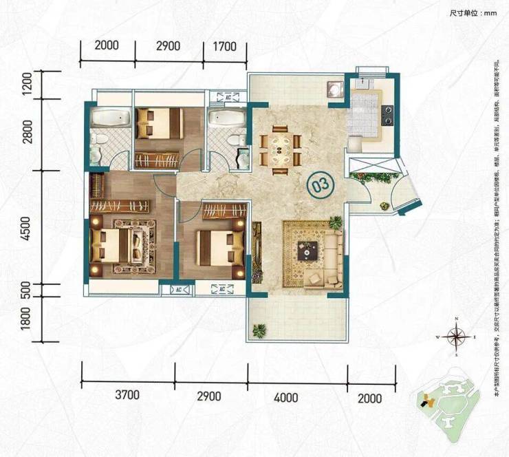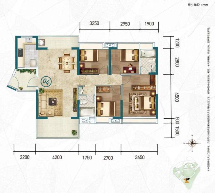 3栋04户型 131平米 4房2厅2卫1厨 平层 南北