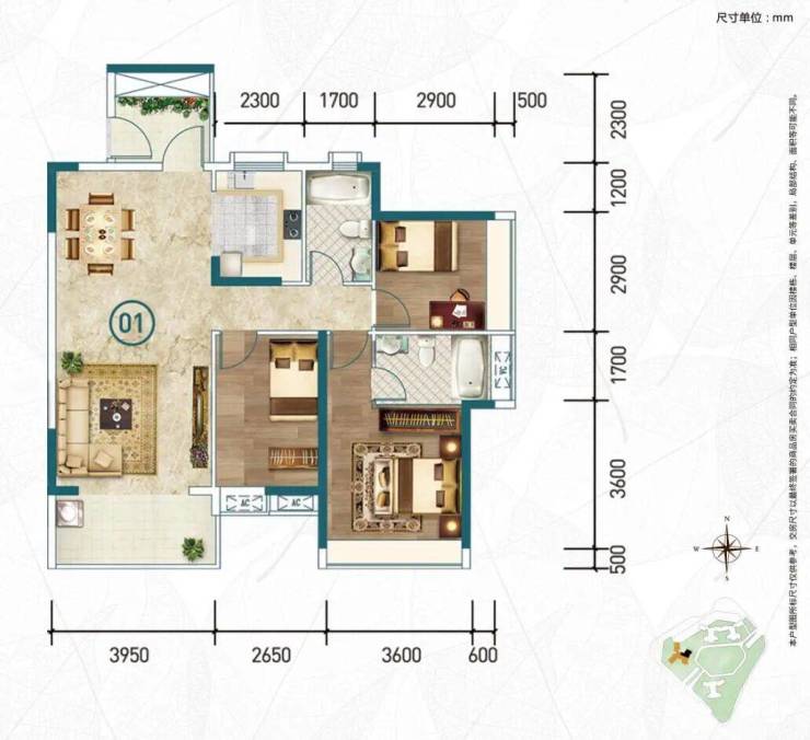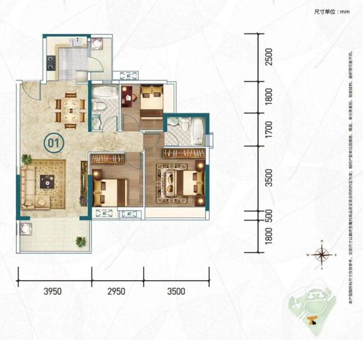 1栋01户型 115平米 3房2厅2卫1厨 平层 东南