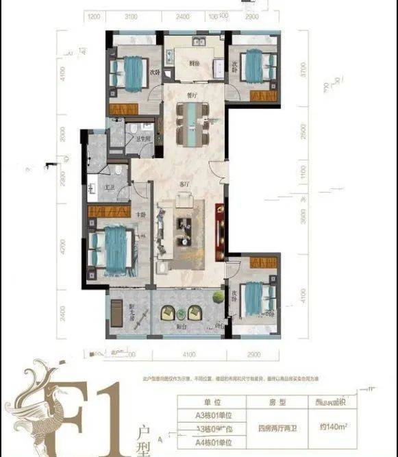 “双龙抱珠”的四房单位,做到了三面宽朝南,采光面达9.6米;卧室带全景飘窗,采风、通风一绝。