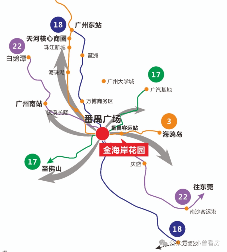 5轨交汇,雄踞双TOD枢纽中心尊处番禺客运站与番禺广场双TOD,五轨交汇(3号线/3号线东延线/18号线/22号线/17号线),一横五纵大动脉畅通四方。