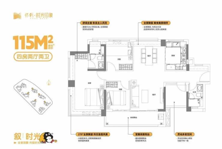 客餐厅一体化,南北通透,采光俱佳,360°无敌采光,主卧270°全景飘窗
