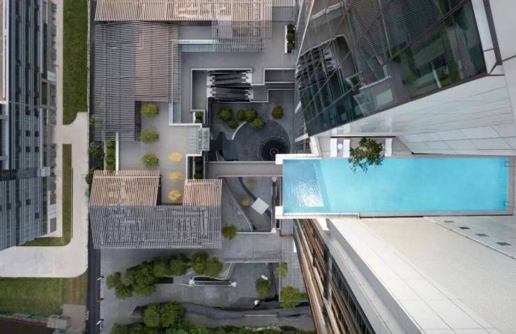区别于将机房放置在泳池正下方的一般做法,项目的设备被藏在下层的塔楼中,同时在同层板底设置轨道,并将吊篮、擦窗机藏进机房旁边,巧妙地将功能隐蔽在结构中。