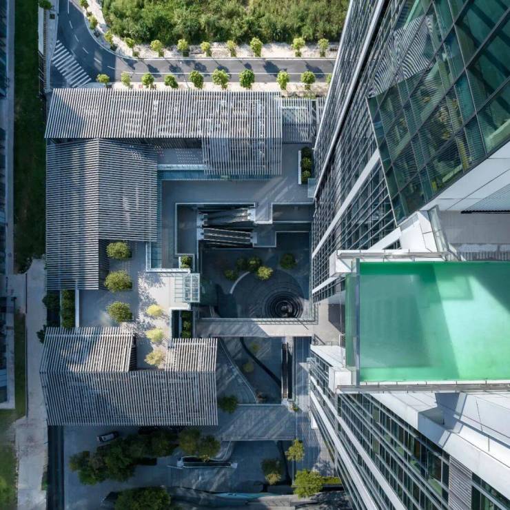 团队通过解构手法将连贯的裙楼雕琢成一个个相对独立的商业空间,塑造出建筑群的独特层次感,同时与极具韵味的开放游廊和架空骑楼,一同构成了岭南园林式乐活商业园。