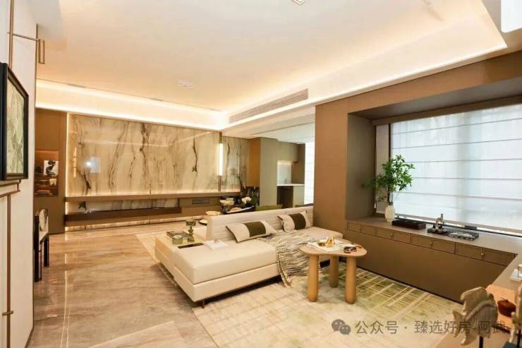 “四开间朝南”,拥有近13米巨幕采光面,将室外的园林景观和阳光毫无保留地引入室内。