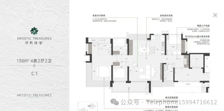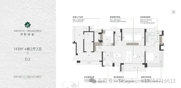 143㎡4+1房3卫:奢华大户型,南北通透,海景一览无余。独立电梯厅和凸窗设计,让每一寸空间都得到极致利用。
