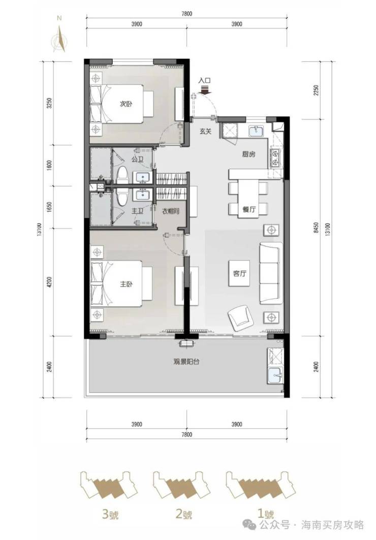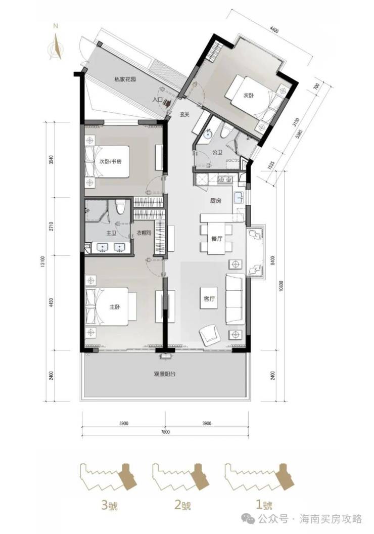 看海纯板房A1户型:130㎡3房2厅2卫
