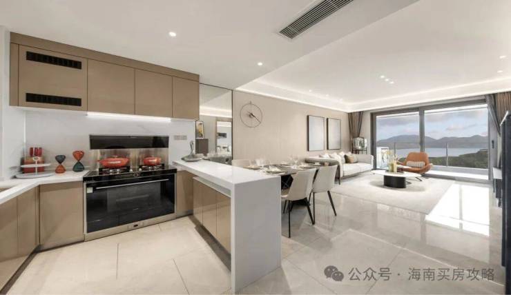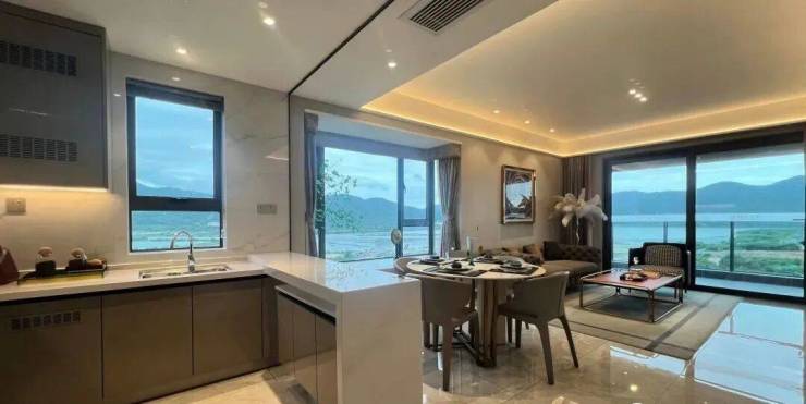↓这是厨房、餐厅和客厅,每个角度的景观都是视觉享受,中间还有个小吧台,平时在这里喝喝酒聊聊天想想都特别舒服。