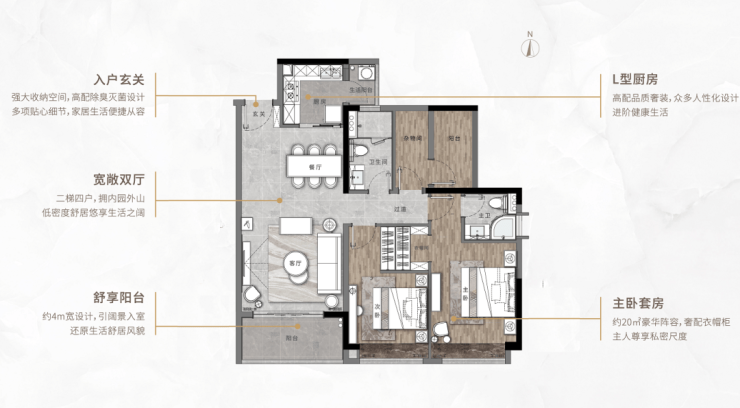 双阳台南北对流,6.5m超宽景观阳台,望大夫山、园林中轴双重景致;