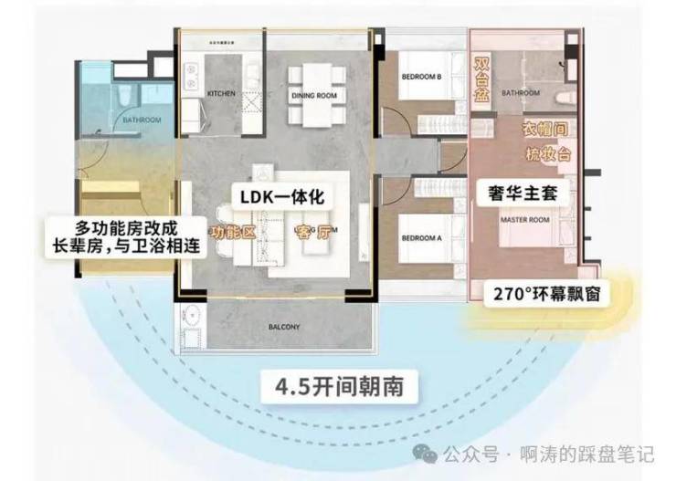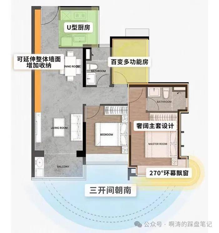 整体价值:6m³整墙收纳+南向9m采光面+5㎡全景厨房+270°景观主卧