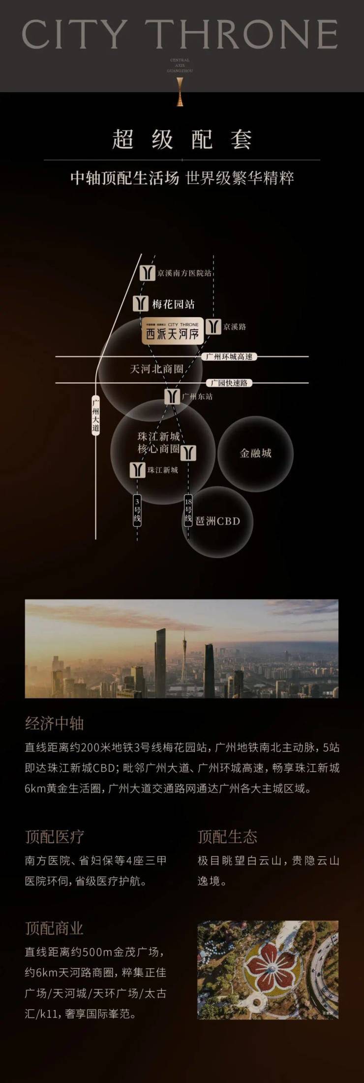 中轴之上,绝版核心地段,罕见的3.0 低容积率,广州首个“智慧+品质”社区,打造具有前瞻性的产品设计;