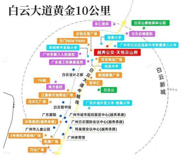 居住品质不仅在于自然环境,更在于生活便利度。天悦云山府3公里范围内汇聚超200万㎡商业体量,包括已开业的云门NEW PARK(白云新城最大商业综合体)、云悦里广场、百世商业广场等,涵盖永辉超市、优衣库、星巴克、IMAX影院等全业态品牌。五星级新世界芊丽酒店也已进驻,提升区域高端服务能级。值得一提的是,云门NEW PARK日均客流超5万人次,已成为白云新城的消费引力中心。未来随着白云新城总部经济集聚,更多高端商业、文化场馆将持续导入,业主既能享受山居静谧,又能随时切换都市繁华模式,真正实现“离尘不离城”。