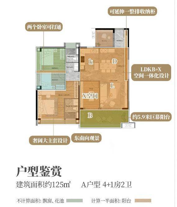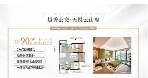 天悦云山府产品力在白云新城堪称标杆。主力户型90-160㎡,精准匹配刚需改善需求。其中90㎡三房做到南向+超宽楼间距+中心园林视野,私密性极佳;125㎡四房为白云山豪宅圈内唯一低于144㎡且无遮挡的一线山景产品,稀缺性凸显;160㎡五房则采用南北通透双阳台设计,瞰景阳台长达6.9米,五开间朝南,主卧配备独立衣帽间,堪比豪宅尺度。更值得称道的是C7栋小高层,仅19层、108户,两梯三户配置,得房率与舒适度远超普通高层。所有楼栋东南偏转45°,确保每户都能最大化揽入白云山景与自然采光,真正实现“户户有景、室室通透”。