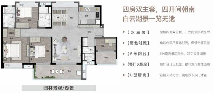 项目整体采用围合式楼栋布局,可以最大程度看白云湖,直接把一线湖景,搬进了业主家中。