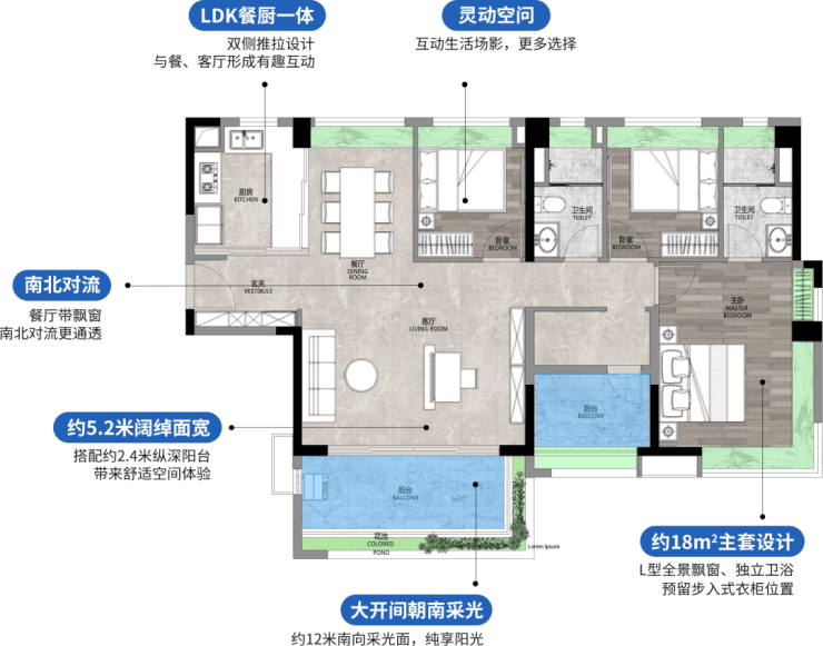 78㎡三房两厅两卫,全新升级三房,四开间朝南,超11米南向采光面,270度超大角度采光,直望广阔园景。
